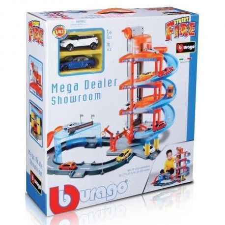 Superbe garage 4 niveaux Méga Dealer de Burago avec 2 véhicules à l'échelle 1/43ème. De nombreuses , actions de jeux dont : rampes d'accès, piste extérieure. Pompe à essence, station de lavage,ascenseur , manuel !