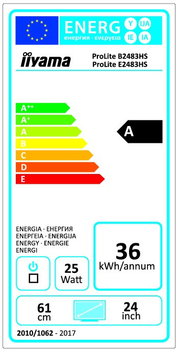 iiyama ProLite E2483HS-B1. Taille de l'écran: 61 cm (24"), Résolution de l'écran: 1920 x 1080 pixels, Type HD: Full HD, Technologie d'affichage: LED. Écran: LED. Surface d'affichage: Mat, Temps de réponse: 1 ms, Format d'image: 16:9, Angle de vision horizontal: 170°, Angle de vision vertical: 160°. Haut-parleurs intégrés. Montage VESA. Couleur du produit: Noir