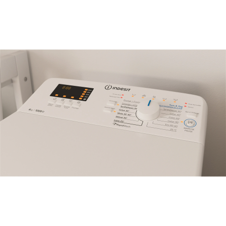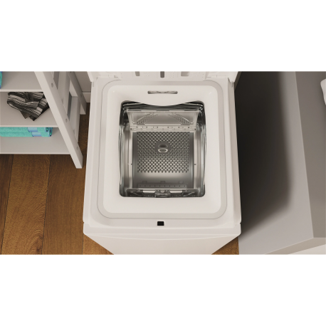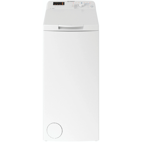 Le lave-linge top BTWNL60400FR/N d'Indesit, chargement par le dessus, a une capacité de 6 litres pour une largeur de 40cm et une vitesse d'essorage de 1000 tours/minute.