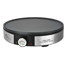Crêpière maxi - Trio - Un appareil 3 en 1 qui s`utilise toute l`année, autant en été qu`en hiver, pour réaliser des crêpes, des galettes ou servir de plancha ! - Grande surface de cuisson de 707 cm² - Plaque en fonte d`aluminium avec revêtement antiadhésif - Thermostat réglable - Témoin de fonctionnement - Finition inox - Puissance 1200 W - Garantie 2 ans.