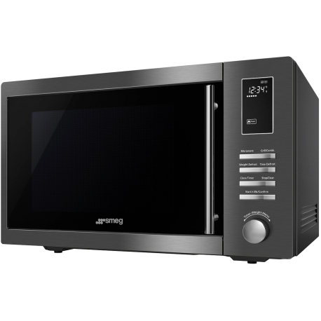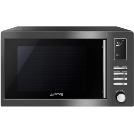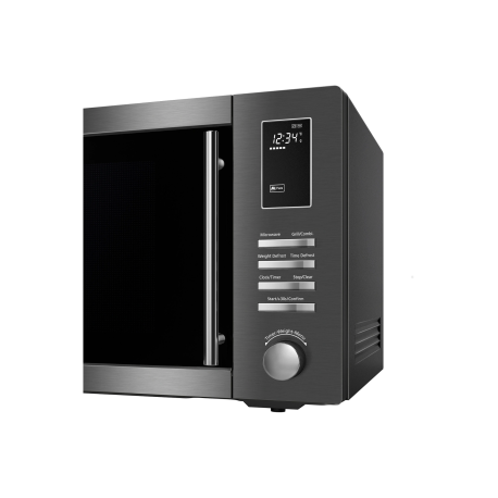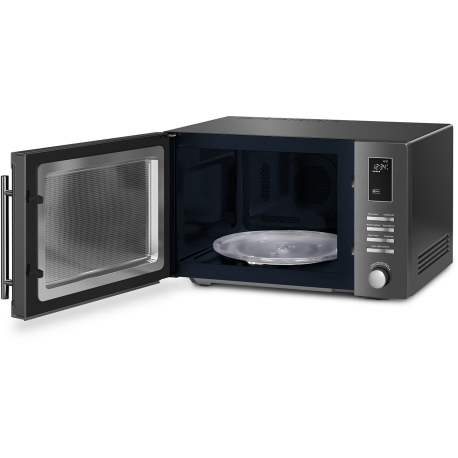 Micro-ondes Gril pose libre Dark Inox, Volume net 25 litres, 900 W - Afficheur LED, commandes par manette et touches, Ouverture latérale par poignée chromée - 6 fonctions dont Pizza, Décongélation selon le temps et Décongélation selon le poids, 10 programmes automatiques - Programmateur électronique début et fin de cuisson, Sécurité enfants - Cavité émaillée en céramique, Plateau tournant Ø 31,5 cm, Gril résistance 1000 W - Grille, Plateau à pizza