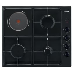 Table de cuisson mixte - 1 plaque et 3 brûleurs dont 1 rapide 3 kW - Allumage intégré aux manettes - Sécurité gaz par thermocouple - Grilles émaillées.