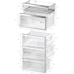 INFORMATIONS GENERALES Volume total : 363 l Réfrigérateur : Volume 260 l Congélateur : Volume 103 l Classe d'efficacité énergétique A sur une échelle allant de A à G Consommation énergétique : 112 kWh/an Niveau sonore : 29 DB, classe d'efficacité sonore : A Confort et sécurité Total No Frost - Plus besoin de dégivrer le congélateur et pas de gouttes d'eau sur la paroi arrière du réfrigérateur. Régulation électronique avec affichage LED de la température Chaque zone de température contrôlable et réglable séparément Alarme visuelle et sonore de température dans le congélateur Design Portes Acier brossé anti-traces Poignées verticales extérieures REFRIGERATEUR Super-réfrigération avec arrêt automatique Eclairage LED à intensité progressive (SoftStart) dans le réfrigérateur 5 clayettes en verre de sécurité, dont 3 réglables en hauteur Flex Shelf : tablette en verre relevable et séparable Rack à bouteilles chromé 1 grand(s) et 3 petits balconnets Système de conservation 1 compartiment VitaFresh avec contrôle de l'humidité - les fruits et légumes restent frais et riches en vitamines plus longtemps 1 compartiment VitaFresh (0-3°C) : garde viandes et poissons frais 2 x plus longtemps CONGELATEUR Super-congélation avec arrêt automatique Pouvoir de congélation : 10 kg en 24h 3 tiroirs de congélation transparents Autonomie en cas de coupure électrique : 21 h INFORMATIONS TECHNIQUES Dimensions (H x L x P) : 203 x 60 x 66.5 cm Classe climatique : SN-T Charnières à droite, réversibles Pieds avant réglables en hauteur, roulettes à l'arrière Voltage 220 - 240 V Longueur du cable d'alimentation : 210 cm Accessoires bac à glaçons