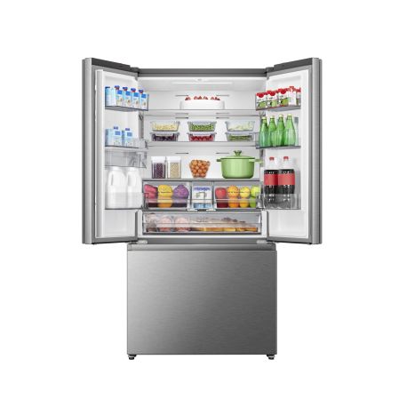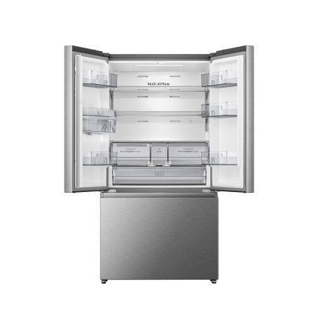 Réfrigérateur 2 portes + 1 tiroir Hisense RF815N4SWSE coloris inox anti-traces avec une capacité totale de 635 L, dont 439 L pour le réfrigérateur et 196 L pour le congélateur - Ce réfrigérateur utilise un système de froid ventilé (no frost) avec la technologie Multi Air Flow qui distribue l’air froid de manière homogène dans les colonnes pour un refroidissement rapide et constant - Le distributeur d’eau en façade permet d’avoir de l’eau fraîche à tout moment, évitant ainsi d`encombrer l’intérieur du réfrigérateur avec des bouteilles - Le contrôle LED intérieur permet de gérer facilement les réglages de température et d`activer des fonctions pratiques comme le mode réfrigération rapide et congélation rapide - L’éclairage LED assure une visibilité optimale tout en étant économe en énergie - Le réfrigérateur est équipé de deux clayettes en verre, de deux bacs à légumes, d’un compartiment fraîcheur pour maintenir vos viandes et poissons à la température idéale, et de trois balconnets - Le congélateur est composé d`un tiroir et d’un tiroir intermédiaire, offrant une capacité de congélation de 7 kg/24h et une autonomie de 14 heures en cas de coupure de courant - Le réfrigérateur est extrêmement silencieux avec un niveau sonore de 37 dB, ce qui le rend adapté à une cuisine ouverte - Ce modèle est également doté de poignées intégrées pour un design épuré et moderne.