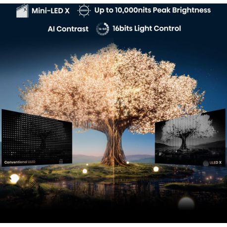 De plus, le rétroéclairage Mini-LED permet d’obtenir des noirs profonds, des contrastes riches et des couleurs éblouissantes. Couplée à une luminosité pouvant atteindre jusqu'à 10 000 nits et à plus de 40 000 zones de Local Dimming, ce Téléviseur vous fait redécouvrir vos films et jeux vidéos préférés dans des conditions idéales, même dans des pièces très lumineuses.