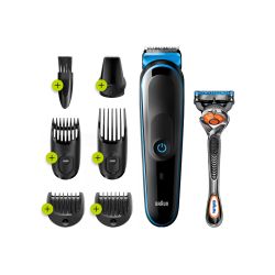 Braun All-in-one MGK5345. Longueur de cheveux minimum: 0,5 mm, Longueur de cheveux maximum: 2,1 cm, Styles de coupe: Barbe longue, Barbe courte. Couleur du produit: Noir, Bleu, Pays d'origine: Chine. Source d'alimentation: Batterie, Durée de fonctionnement (min): 100 min, Type de batterie: Batterie intégré. Poids: 340 g. Type d'emballage: Boîte